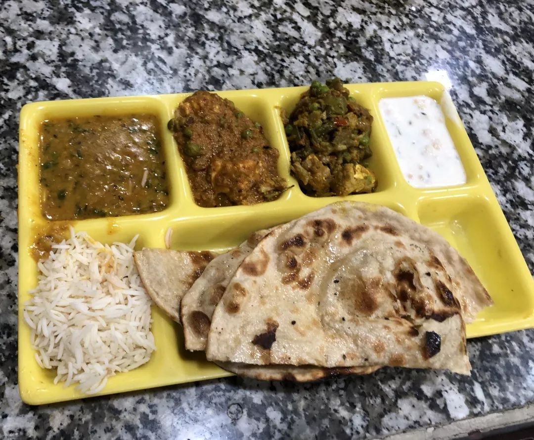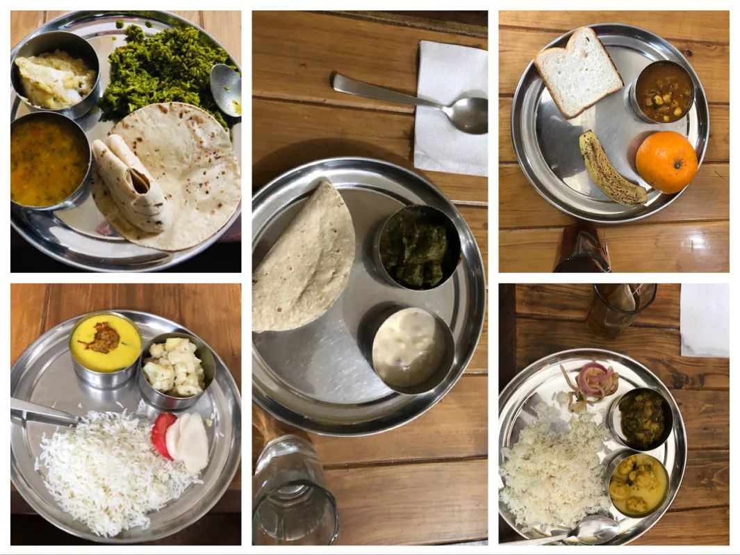 然后是饮食。瑞诗凯诗是印度,乃至全世界的瑜伽圣城,整座城市都是素食,学校里更是尽可能以vegan food为主。每天的食物很简单,也没啥花样,基本就是咖喱汤配上各种蔬菜、米饭和chapati(印度薄饼),加上无限量供应的绿茶,有时会有(不太好吃的)甜品,早餐会配上一些水果。